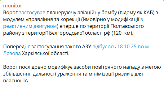Як інформує Telegram-канал Monitor, противник використав по Полтавському району планувальну авіабомбу з модулем управління та корекції, імовірно, у модифікації з реактивним двигуном, з території Бєлгородської області, а це — приблизно 120 км.