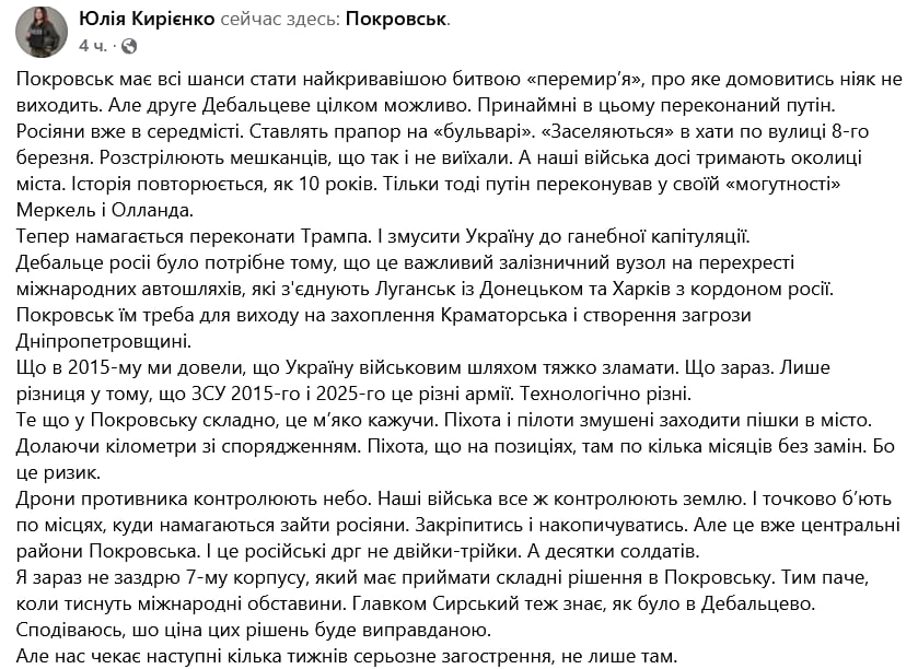 "Я зараз не заздрю 7-му корпусу, який має приймати складні рішення в Покровську. Тим паче коли тиснуть міжнародні обставини. Главком Сирський теж знає, як було в Дебальцеве. Сподіваюсь, що ціна цих рішень буде виправданою", — йдеться в дописі.