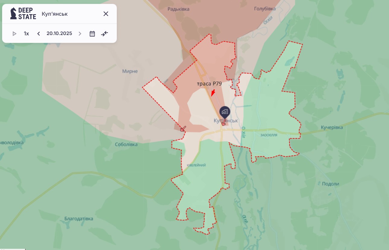 На карті аналітиків DeepState бачимо зміни, які з'явились 19 жовтня. В Куп'янську розрослись два червоні "гаки", які показують зону просування ЗС РФ. Центральний "гак", який тягнеться по Р79, розрісся на 1 км. Західніший, який тягнеться через річку Куп'янку, має орієнтовну довжину 1,5 км.