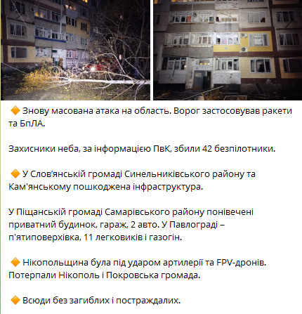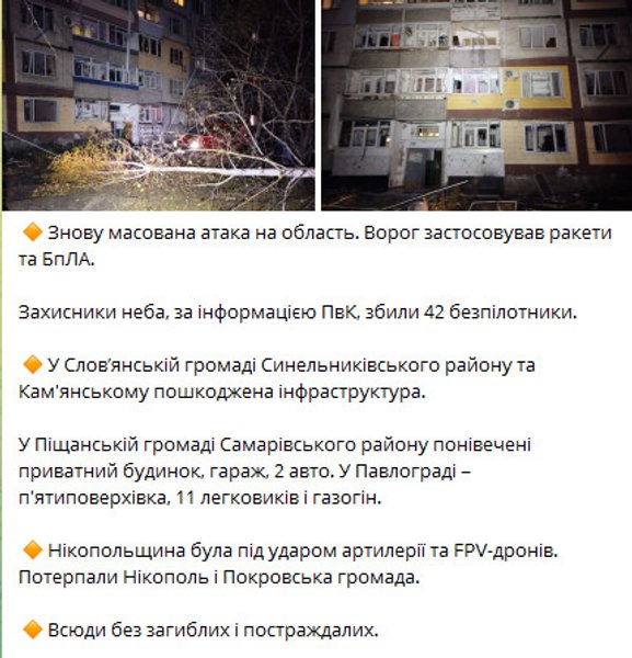 Сили ППО збили 42 безпілотники, проте зафіксовано пошкодження інфраструктури у Слов’янській, Піщанській та Павлоградській громадах.