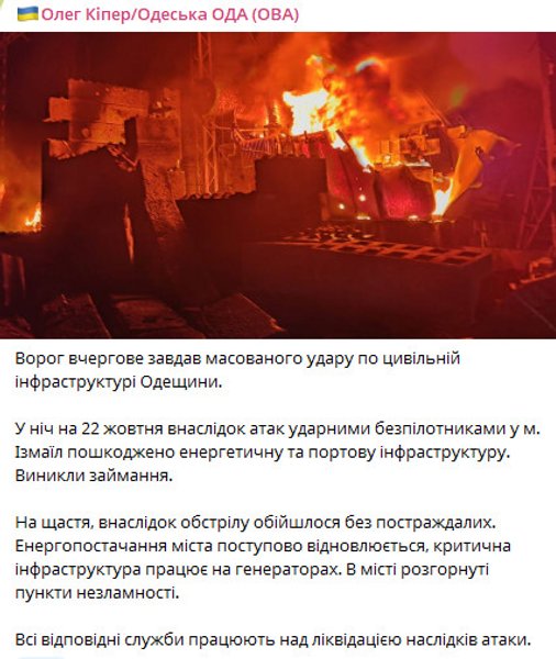 Начальник ОВА Олег Кіпер повідомив, що ударні безпілотники вночі атакували Ізмаїл.