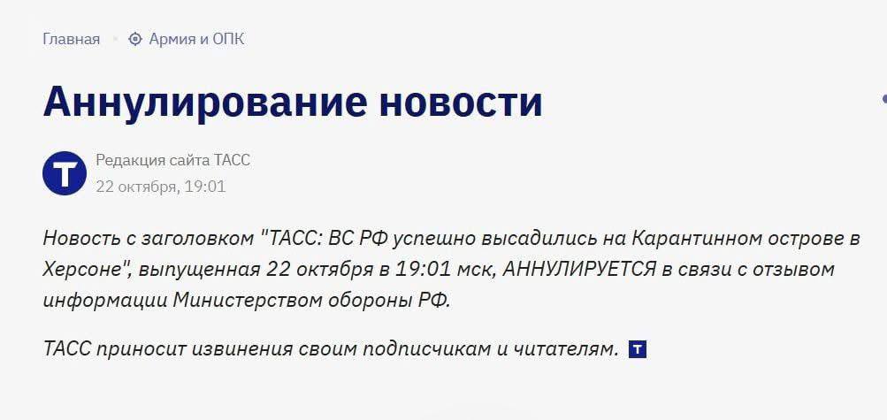 Тимчасом пропагандистський ресурс ТАСС анулював новину про висадку російської армії на Карантинному острові "у зв'язку з відкликанням інформації Міністерством оборони РФ".