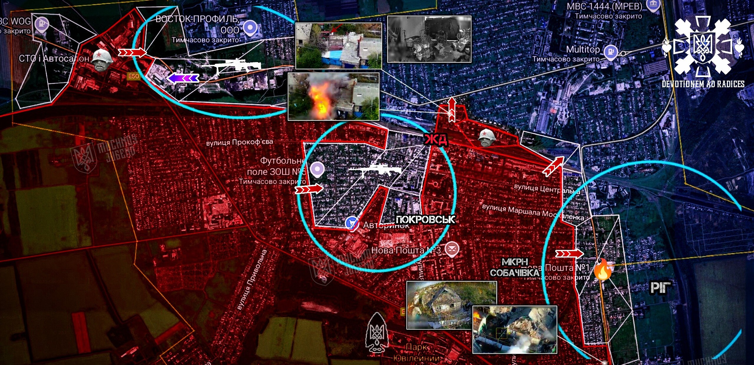 Про ситуацію в Покровську станом на 23–24 жовтня розповів боєць ЗСУ з повним "Мучной" у Telegram-каналі. Військовий пояснив, що Сили оборони ще втримуються на вулицях північніше центру Покровська, але росіяни з'являються у районі "Динас" (на півночі). На його думку, українські підрозділи в цьому районі варто було б "вже забрати". Крім того, майже втрачено район Собачівки (південний схід від центру та залізниці), але тримається промзона "Цитадель".