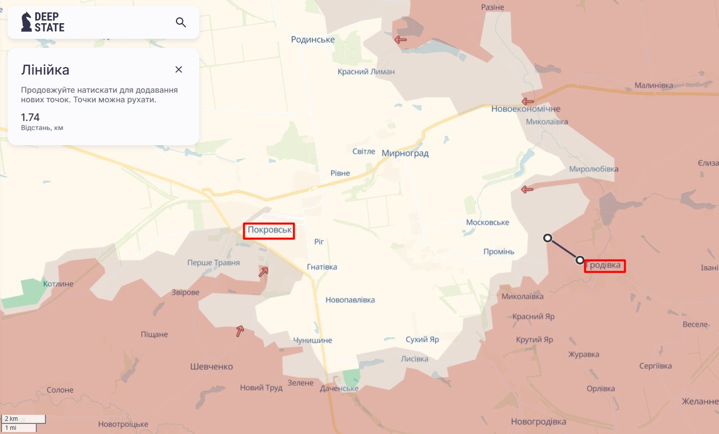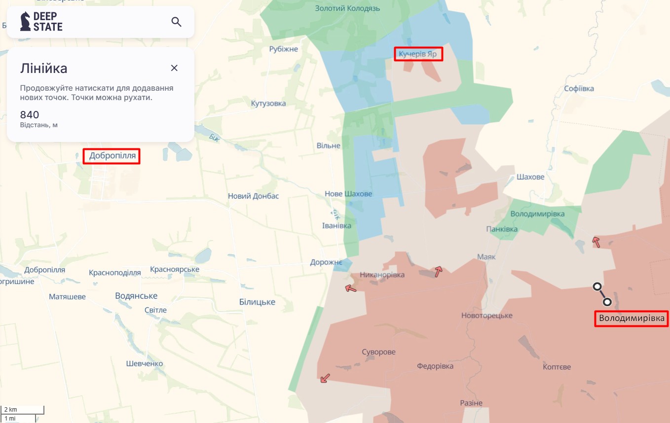Покровський напрямок. На карті аналітиків також є зміни ситуації під Покровськом. Зокрема, DeepState показав зміни у Кучеровому Яру: бійці ЗСУ звільнили більшу частину села від російських окупантів, але все ще є невелика червона ділянка на півдні. Водночас ЗС РФ просунулись у двох точках — поруч з Гродівкою (приблизно 1,7 км) та Володимирівкою (орієнтовно 800 м).