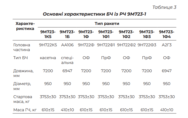 В аналізі також згадуються модифікації 9М723-1Б, що використовують спеціальну боєголовку AA106. Розміри та маса цієї модифікації відповідають серійному стандарту: довжина становить 7,2 метра, а стартова маса — 3,8 тонни. При цьому боєголовка меншого розміру важить приблизно 410 кілограмів.