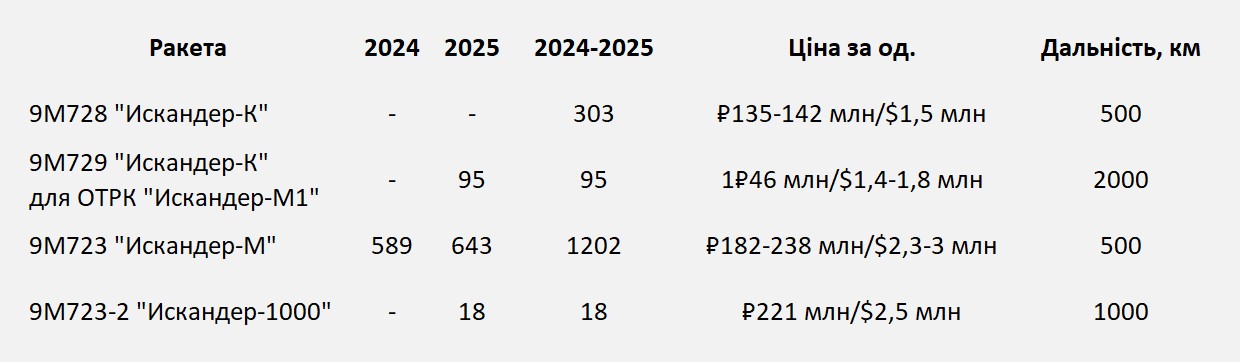 Дані ВПК РФ показували, що найбільший інтерес у ЗС РФ викликали базові варіанти балістичних ракет 9М723 "Іскандер-М" та крилатих ракет 9М728 "Іскандер-К". Крім того, балістики у 2025 році більше майже на 10%.