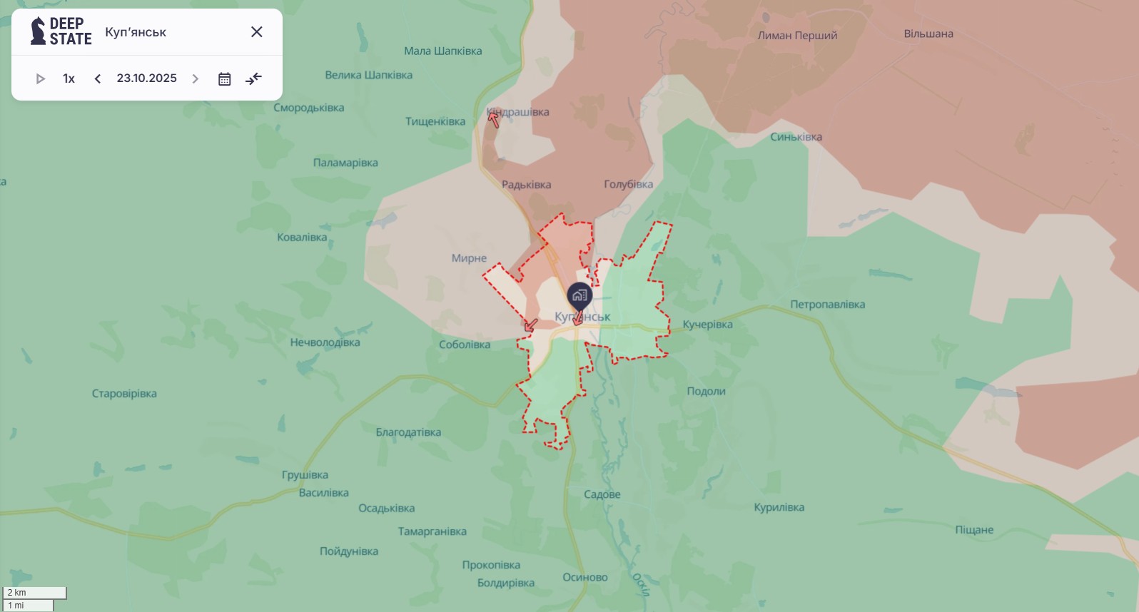 "Головне, що і в Куп'янську, і в Покровську війна перейшла в фазу саме міських боїв. В обох випадках це відбувається отакою саме дифузією, отаким дуже поступовим заняттям окремих оцих точок, між якими лишається така величезна сіра зона", — сказав він.