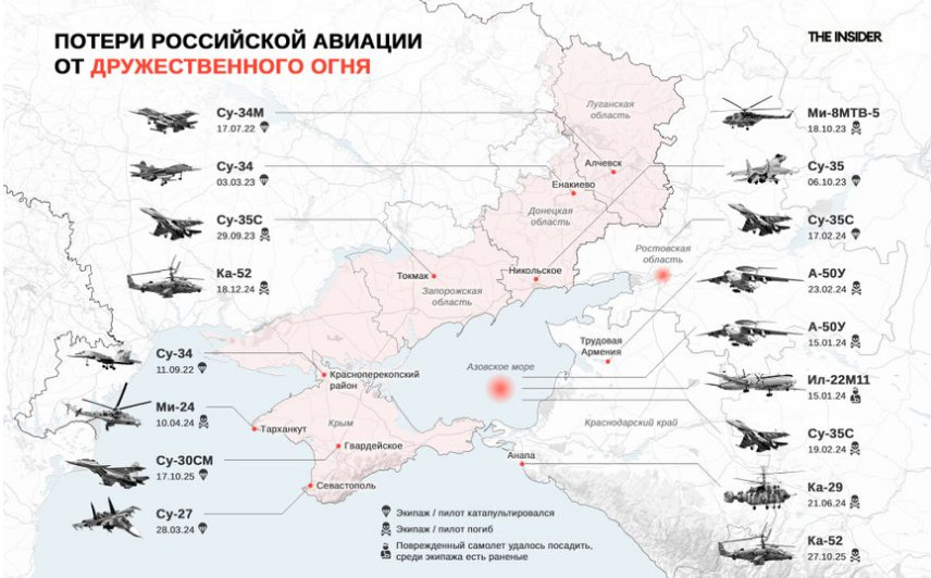 Загалом від "дружнього вогню" Росія вже втратила щонайменше 12 літаків (чотири Су-35, три Су-34, два А-50, а також по одному Су-27, Су-30 і Іл-22) і п’ять вертольотів (два Ка-52, один Ка-29, Мі-24 і Мі-8).