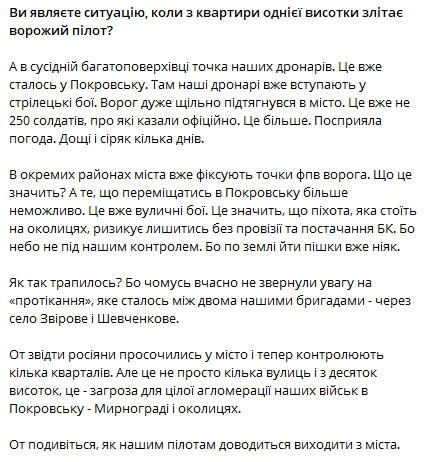 "Це означає, що пересування Покровськом стало майже неможливим. У місті точаться вуличні бої, а підрозділи на околицях ризикують залишитися без постачання боєкомплекту і продовольства. Повітря не під нашим контролем, а наземні шляхи руху заблоковані", — зазначила вона.