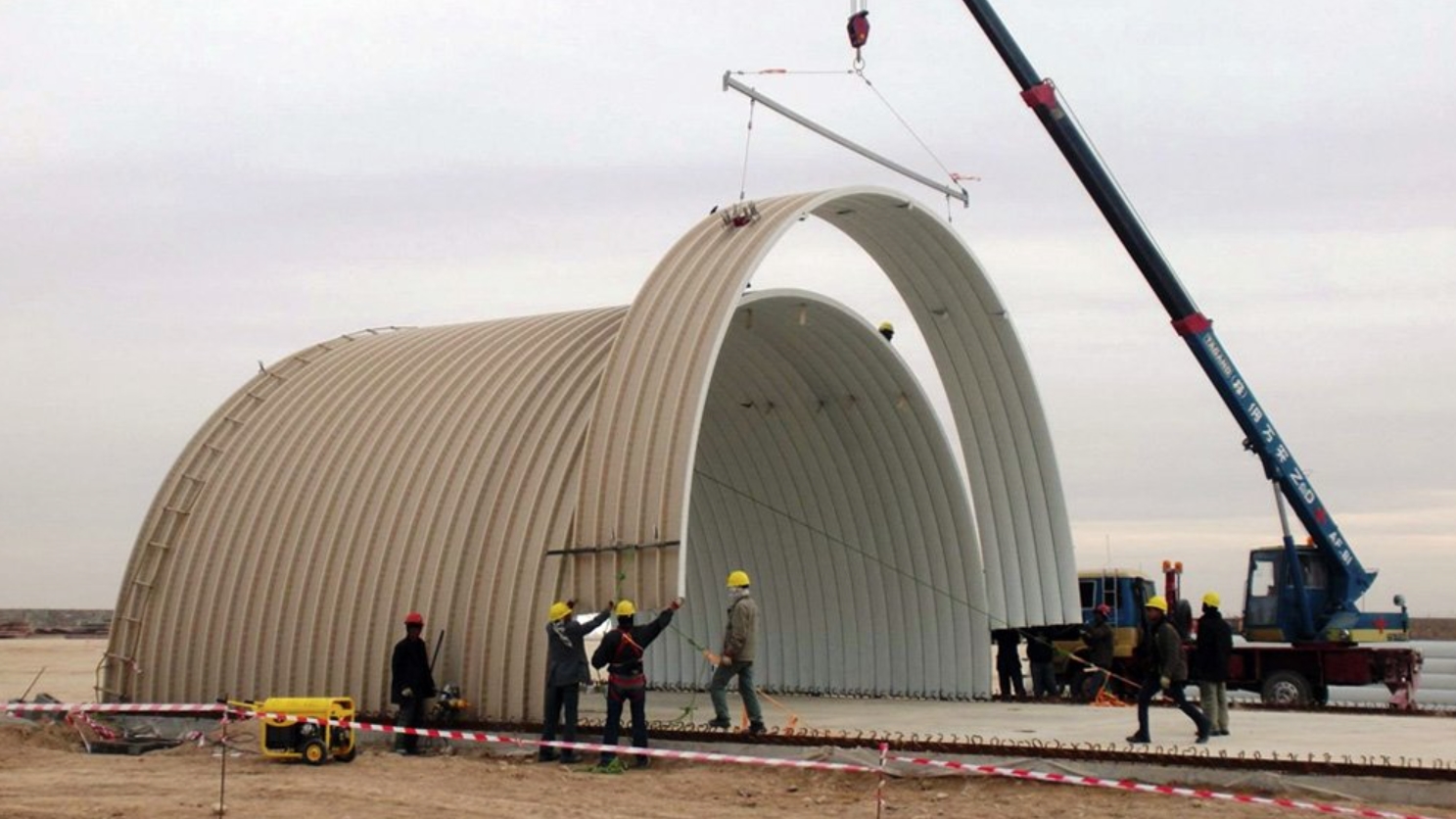 Виробництво трьох конструктивних елементів займає всього кілька хвилин, що робить технологію незамінною за необхідності швидкого зведення ангарів, складів, гаражів або захисних укриттів.