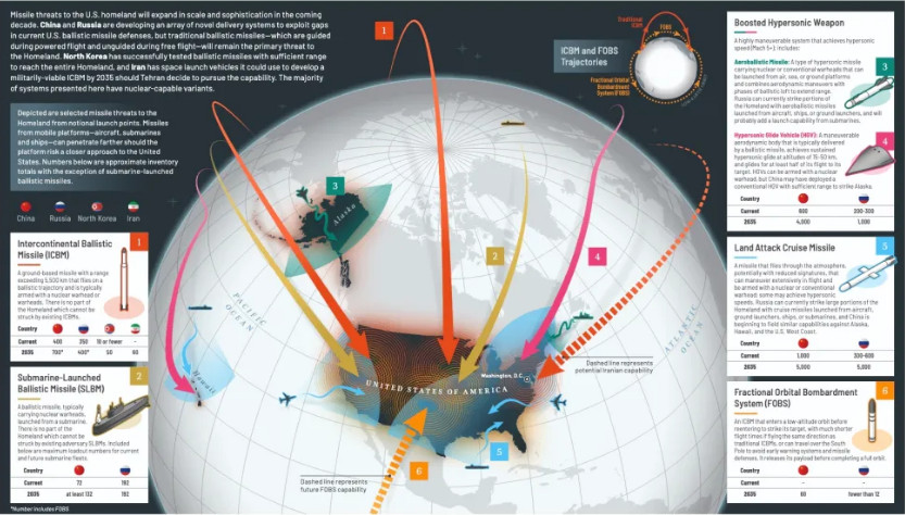 За даними американської розвідки, Китай і Росія активно розширюють свої арсенали. Обидві країни додають міжконтинентальні ракети та розробляють гіперзвукові системи, здатні до маневрування на надзвукових швидкостях.