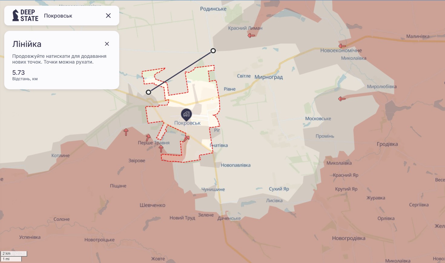 На оновленій карті DeepState станом на ранок 30 жовтня бачимо розширення червоної зони у район Першого Травня. Орієнтовне просування РФ — на відстань приблизно 1,7 км. Крім того, можна виміряти відстань між "зубцями" сірої зони, яка на три чверті охоплює Покровськ — це 5 км. Глибина "кишені", на "дні" якої розташований Мирноград та бійці ЗСУ, які тримають там оборону, — приблизно 11-12 км.