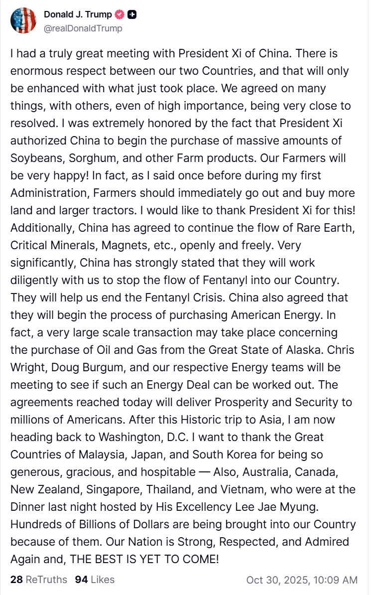 "У мене була воістину чудова зустріч із головою Сі Цзіньпіном... Ми досягли згоди з багатьох питань, а деякі, навіть найважливіші, були дуже близькі до вирішення", — заявив Трамп. У своєму пості на Truth Social він заявив, що Сі Цзіньпін дозволив Китаю почати закупівлю величезних обсягів сої, сорго та іншої сільськогосподарської продукції в США, а також погодився продовжити постачання рідкоземельних металів і критично важливих мінералів.