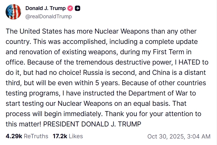 Але Трамп написав ще один пост, у якому заявив, що США відновлюють ядерні випробування після 30-річного мораторію, повідомивши, що Китай і Росія — інші найбільші ядерні держави світу — можуть наздогнати США протягом п'яти років.