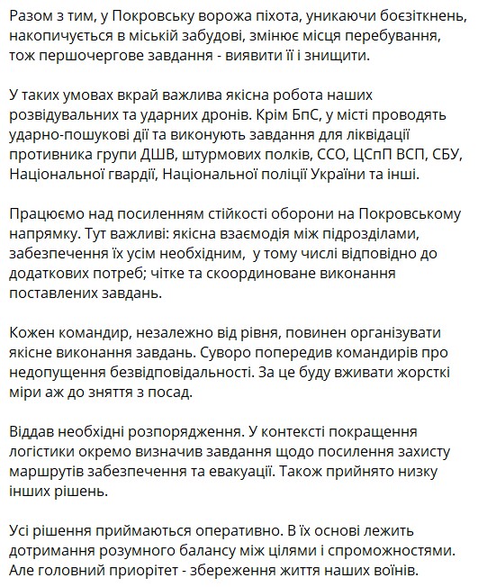 Зі слів Сирського, на територію міської забудови проникли диверсанти ЗС РФ, які накопичуються у схованках та постійно змінюють місце дислокації. Щоб впоратись з цією проблемою, у Покровськ та Куп'янськ направили більше операторів БпЛА, які відшукують укриття росіян.
