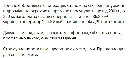 У Добропіллі продовжують контратаки ЗСУ, додав Сирський. Згідно з даними командування, вдалось повернути контроль над 186,8 кв. км території.