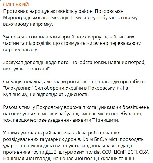 Інформація про начебто "блокування" у Покровську та Куп'янську — це російська пропаганда, ідеться у дописі Сирського у Telegram-каналі. Генерал заявив, що ситуацію виправляють оператори Сил безпілотних систем, і також бійці "ДШВ, штурмові полки, ССО, ЦСпП ВСП, СБУ, Нацгвардії, Нацполіції та інші".