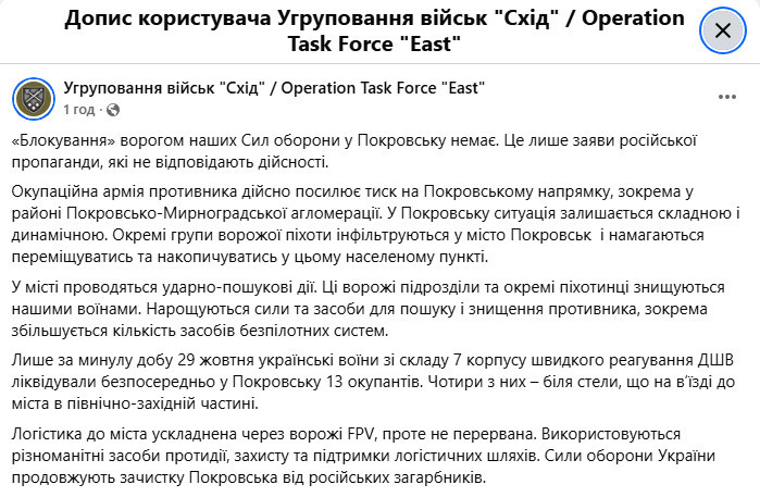 Угруповання також уточнило, що логістика до Покровська ускладнена через активне застосування російських FPV-дронів, однак залишається діючою. Українські сили використовують різні засоби протидії та захисту логістичних маршрутів.