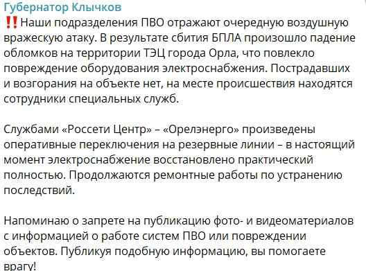 У себе в Telegram-каналі він написав, що "внаслідок збиття БпЛА сталося падіння уламків на території ТЕЦ", що призвело до пошкодження обладнання електропостачання.