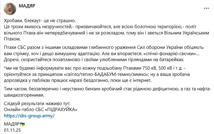 Він написав, що блекаут — це не страшно, і пообіцяв, що його "Птахи" з СБС разом із Силами оборони України забезпечать громадянам РФ "стрімку, хоч і вимушену адаптацію".