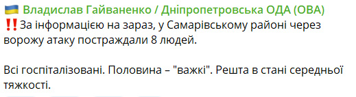 Т. в. о. голови Дніпропетровської обласної військової адміністрації Владислав Гайваненко повідомив, що внаслідок атаки по Самарівському району постраждало вісім осіб. Усіх їх госпіталізовано. Половина з них — у важкому стані, решта — у стані середньої тяжкості.