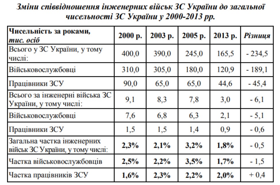 "Таким чином, станом на 31 грудня 2013 р. в інженерних військах ЗСУ залишилося тільки три інженерних полки та один понтонно-мостовий полк", — підсумували на порталі, зауваживши, що тоді ж ліквідували систему підготовки фахівців.