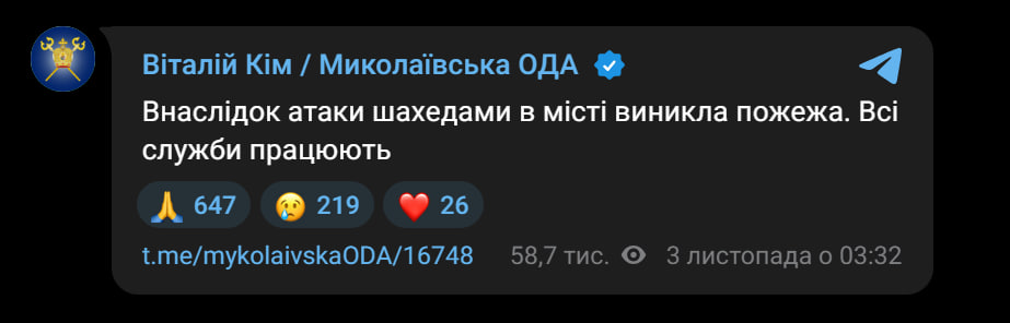 У ніч на 3 листопада російська армія здійснила чергову серію атак безпілотниками по території України. Найбільшої шкоди зазнали Сумська, Миколаївська, Дніпропетровська та Запорізька області: є загиблі, поранені та руйнування цивільної інфраструктури.