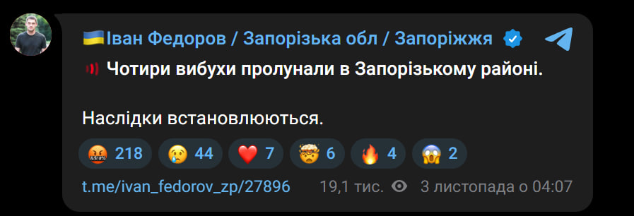 Тим часом у Запорізькій області зафіксовано нові руйнування. За даними начальника Запорізької ОВА Івана Федорова, приблизно о 04:00 у Запорізькому районі пролунали чотири вибухи. Внаслідок удару по обласному центру поранено трьох людей.