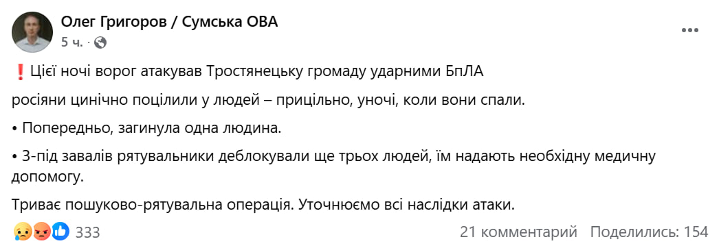 За словами голови Сумської обласної військової адміністрації Олега Григорова, уночі російські дрони вдарили по житловому сектору Тростянецької громади. Уражено будинки, в яких на той момент перебували люди. Попередньо загинула одна людина. З-під завалів рятувальники дістали трьох постраждалих, їм надають медичну допомогу. На місці продовжуються пошуково-рятувальні роботи, інформація щодо наслідків обстрілу уточнюється.