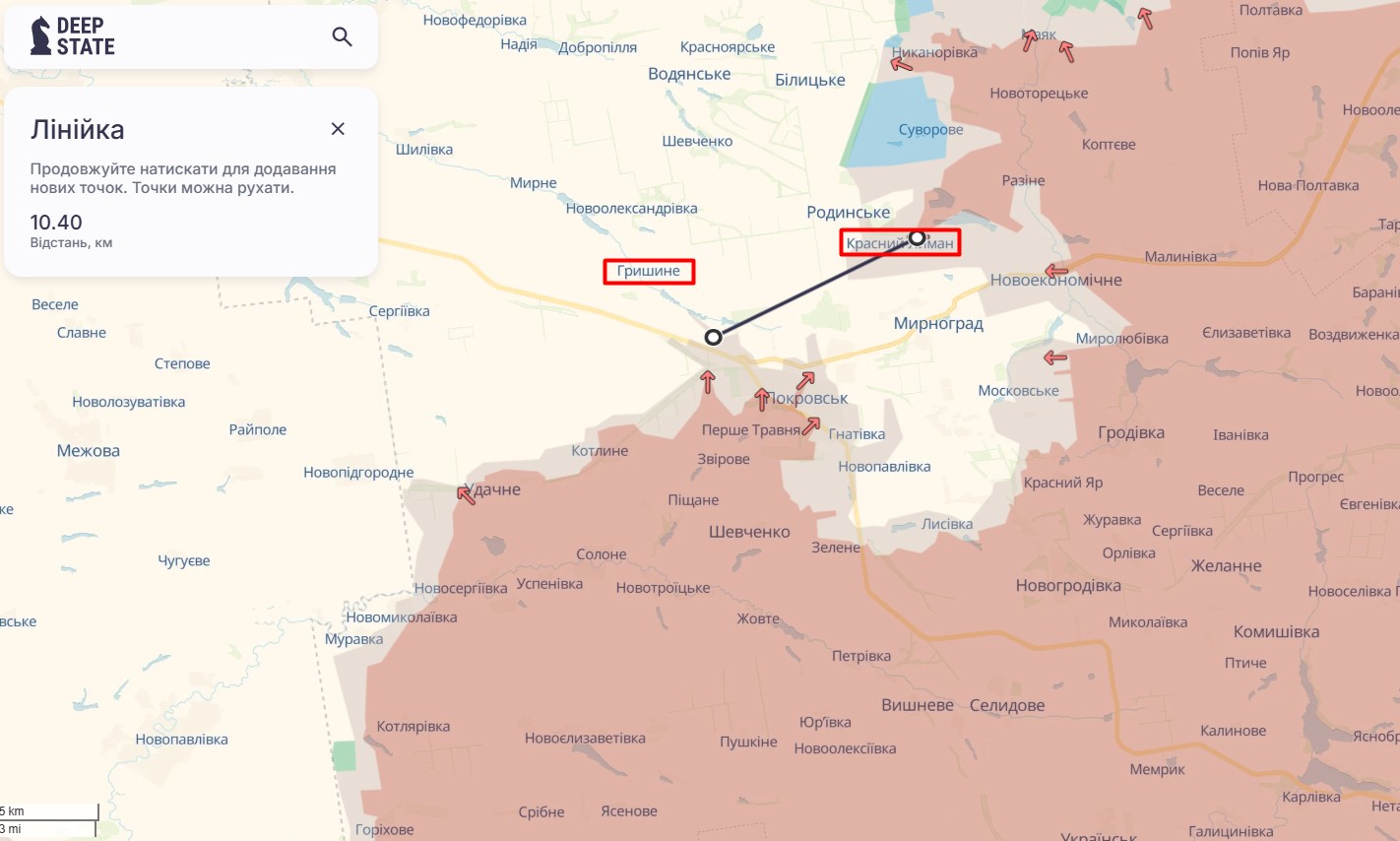 На карті бойових дій DeepState бачимо, що Гришини та Красний Лиман — населені пункти, розташовані північніше Покровська. Відстань між краями "сірої" зони — близько 10 км.