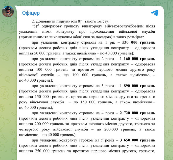 Як повідомив "Телеканал Прямий" з посиланням на старшого лейтенанта Сил оборони України з позивним "Алекс", уряд готує поетапну систему нарахувань винагороди для контрактників. Розмір виплат визначатиметься тривалістю контракту — від одного до десяти років, а система включатиме початкову суму при підписанні та щомісячні нарахування.