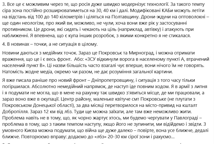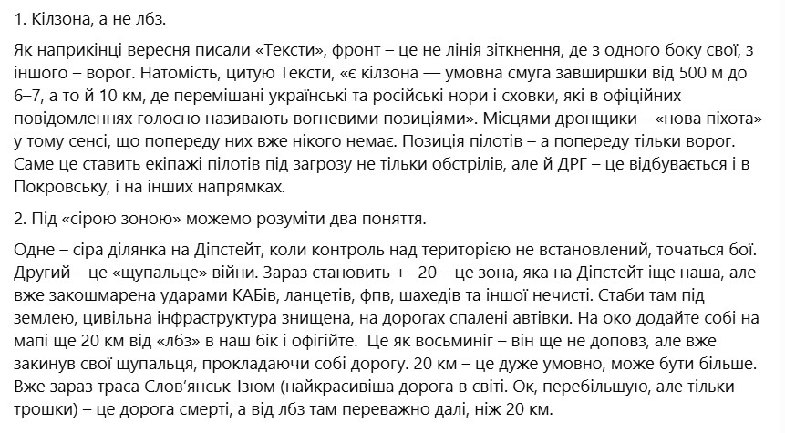 Засоби ураження Збройних сил Російської Федерації створили "сіру зону" на відстані не 1-3 км, а 20 км від лінії бойового зіткнення, написала військова. Через це у Покровську оператори дронів опиняються на передній лінії та контактують російськими диверсантами, а у Дніпропетровській області фронт все відступає.