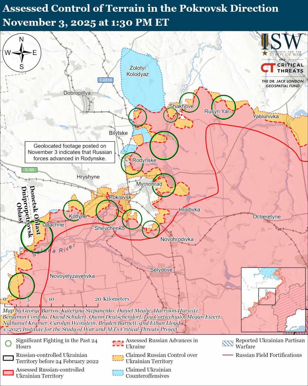 Як повідомляє Інститут вивчення війни (ISW), російські війська продовжують наступ у напрямку Покровська. Геолокаційні відеозаписи, опубліковані 3 листопада, підтверджують просування підрозділів 5-ї мотострілецької бригади Росії в південних районах Мирнограда та у східній частині Родинського. Інші матеріали показують, що українські сили завдали удару по двох російських військових у північно-західному секторі Покровська, які, за оцінкою ISW, здійснювали інфільтрацію, однак це не вплинуло на лінію контролю.
