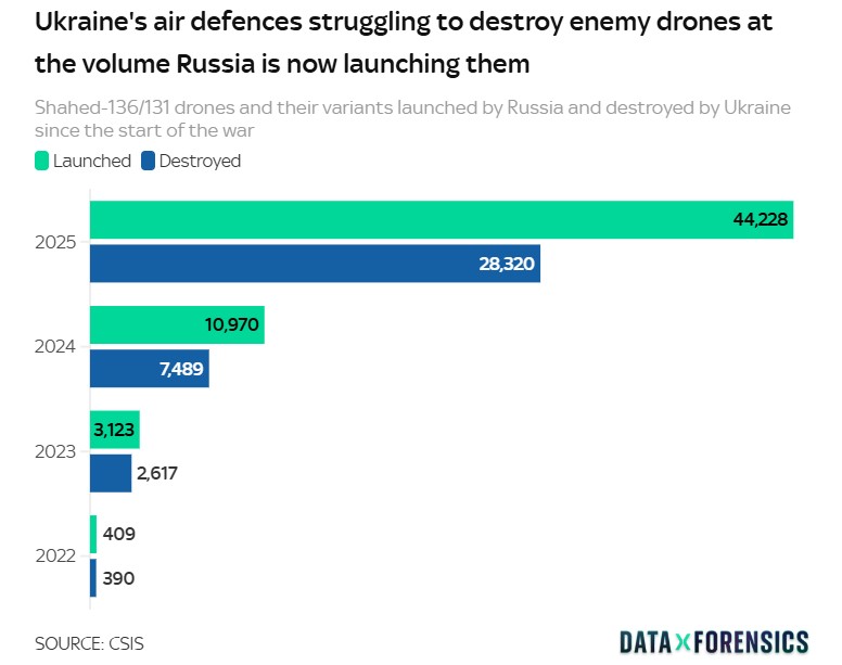 Медіа опублікувало дані аналітичного центру CSIS щодо кількості "Шахедів", запущених ЗС РФ з 2022 по жовтень 2025 року, і про ефективність роботи ППО ЗСУ. Інфографіка аналітиків показує: