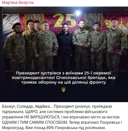 "І ми втрачаємо місто за містом в один і той самий спосіб. Тепер втратимо Покровськ і Мирноград. Уже понад 80% Покровська під росіянами", — написала вона, нагадавши, що раніше так само були втрачені Бахмут, Соледар та Авдіївка.