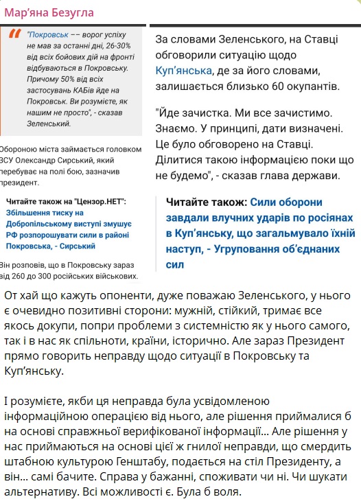 "І розумієте, якби ця неправда була усвідомленою інформаційною операцією від нього, але рішення ухвалювали б на основі справжньої верифікованої інформації... Але рішення у нас ухвалюють на основі цієї самої гнилої брехні, яка смердить штабною культурою Генштабу, яку подають на стіл Президенту, а він... самі бачите", — підкреслила вона.