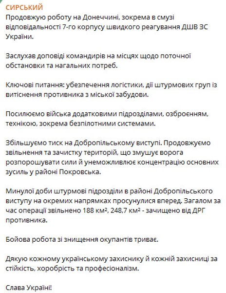 Головнокомандувач ЗСУ Олександр Сирський 3 листопада повідомив: "Посилюємо війська додатковими підрозділами, озброєнням, технікою, зокрема безпілотними системами. Продовжуємо звільнення та зачистку територій, що змушує ворога розпорошувати сили й унеможливлює концентрацію основних зусиль у районі Покровська".
