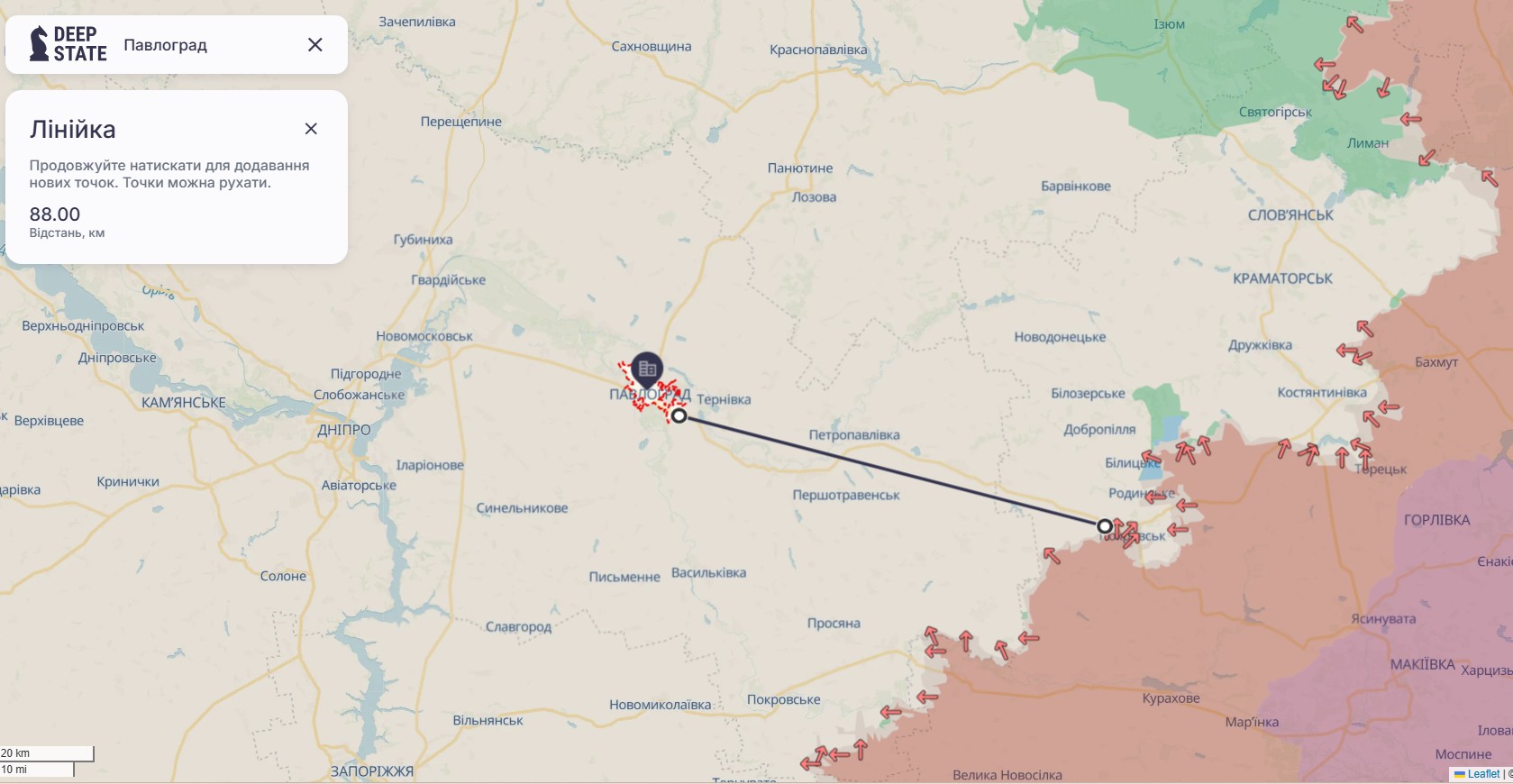 Павлоградський хімзавод — підприємство, яке займається виготовлення вибухових речовин та ракетного палива, розташоване у місті Павлоград Дніпропетровської області. Неподалік проходить траса Е-50, якою можуть просуватись ЗС РФ з боку Покровська (карта DeepState показує орієнтовну відстань — 88 км по прямій). На Google maps не вказані обриси підприємства, лише можна відшукати головний адміністративний корпус Павлоградського хімзаводу, розташований на околиці міста.