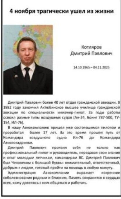 Скриншот некролога авіакомпанії щодо комадира Котлярова з Іл-76 з Судану