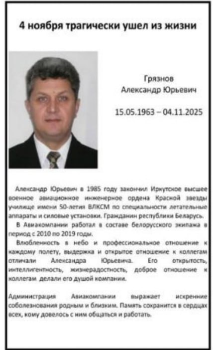 Скриншот некролога авіакомпанії щодо штурмана Грязнова з Іл-76 з Судану