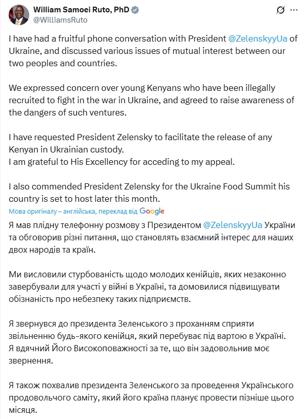 "Ми висловили стурбованість щодо молодих кенійців, яких незаконно завербували для участі у війні в Україні, й домовилися підвищувати обізнаність про небезпеку таких авантюр. Я звернувся до президента Зеленського з проханням сприяти звільненню кенійців, які перебувають під вартою в Україні. Я вдячний… за те, що він задовольнив моє звернення", – написав Руто у соцмережі X.