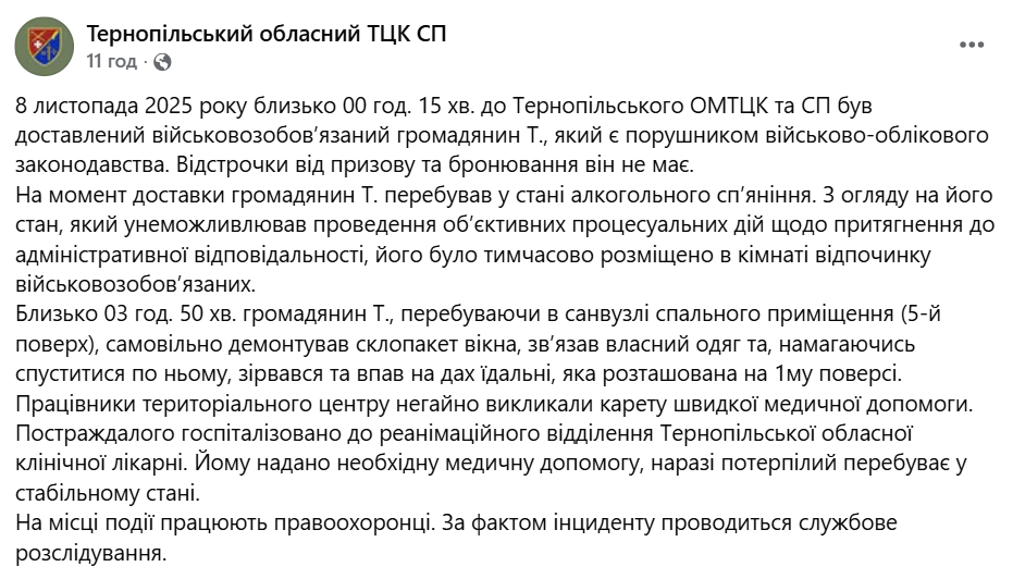 У Тернополі військовозобов'язаний чоловік у ніч на 8 листопада намагався втекти з будівлі ТЦК через вікно за допомогою зробленої власноруч "мотузки" з власного одягу. У результаті він впав та опинився у реанімації.