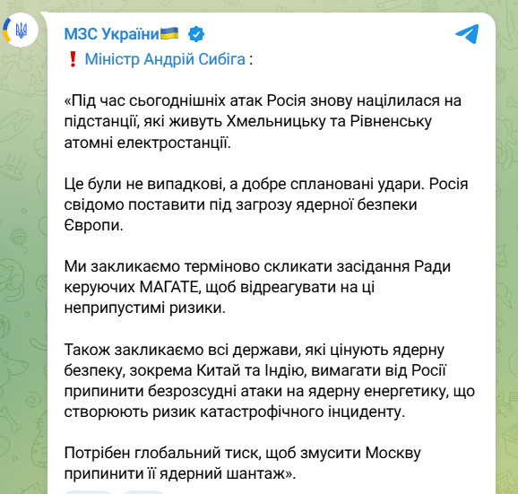 "Росія навмисно ставить під загрозу ядерну безпеку в Європі", – заявив Сибіга. Він закликав всі держави, які цінують ядерну безпеку, зокрема Китай та Індію, вимагати від РФ припинити безрозсудні атаки на атомні об’єкти.
