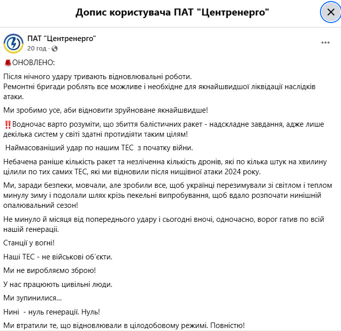 "Електростанції горять… наразі виробництво електроенергії зведене до нуля", – повідомила компанія "Центренерго".