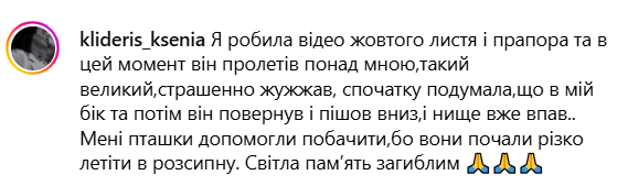 "Я робила відео жовтого листя і прапора, і в цей момент він ("Шахед", – прим. авт.) пролетів наді мною, такий великий, страшенно жужжав, спочатку подумала, що в мій бік, а потім він повернув і пішов униз і вже впав. Світла пам'ять загиблим", — написала в коментарях одна зі свідків трагедії.