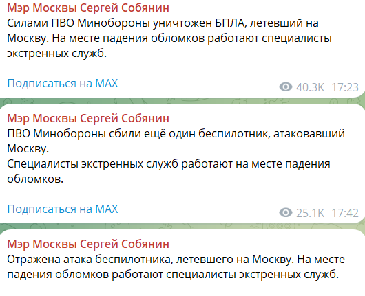 Також повідомлялося, що 26 жовтня сили ворожої ППО нібито збили шість безпілотників, які летіли в напрямку Москви.