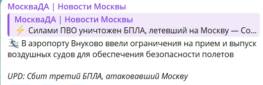 За інформацією Telegram-каналу "Новости Москвы", в аеропорту "Внуково" ввели обмеження на приймання і випуск повітряних суден для гарантування безпеки польотів. Аналогічна ситуація — і в периметрі повітряного простору "Шереметьєво".