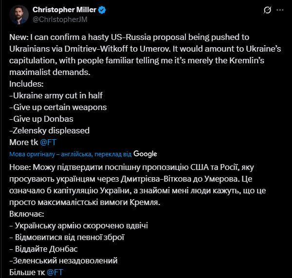 Натомість журналіст Financial Times Крістофер Міллер додає більше деталей щодо угоди, а також зазначає, що Зеленський незадоволений пропозицією.