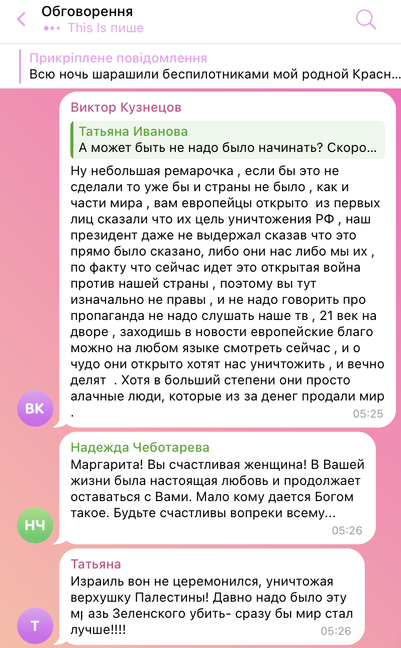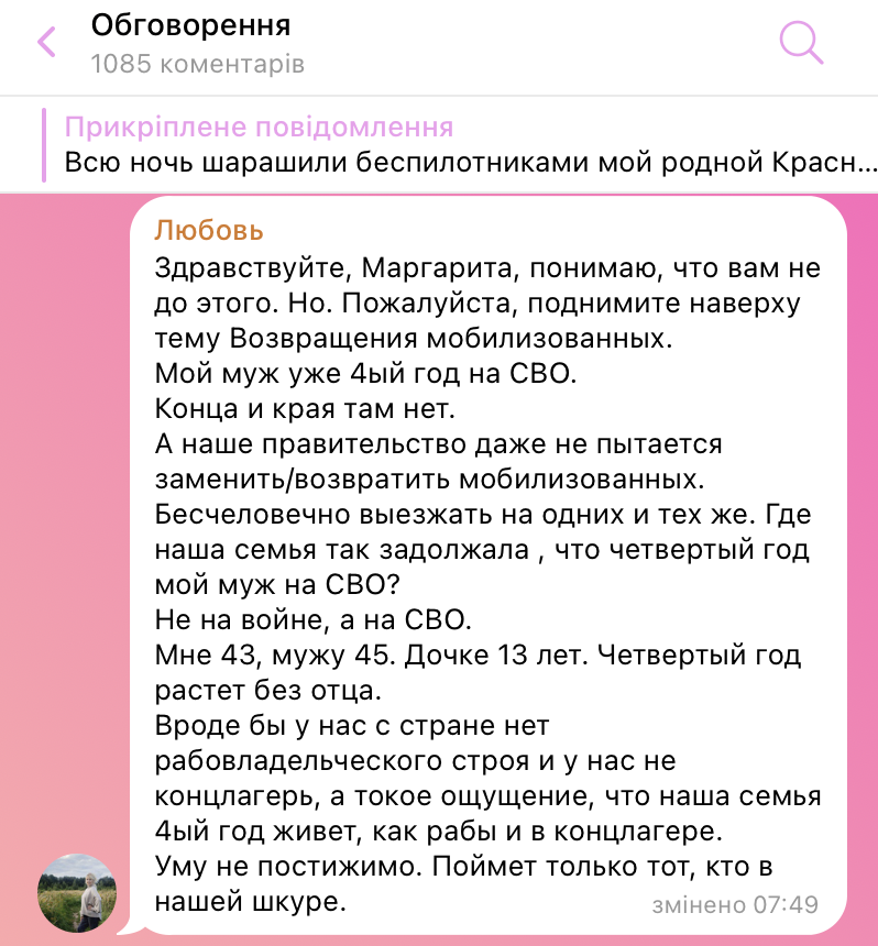 Серед коментарів з побажаннями пропагандистці та погроз можна знайти й звернення дружин так званих учасників "СВО", якою у РФ називають війну в Україні, які нібито мають принести росіянам бажану перемогу. Одна з таких жінок написала про "морок і жах, про який всі мовчать" у лавах окупаційної армії.