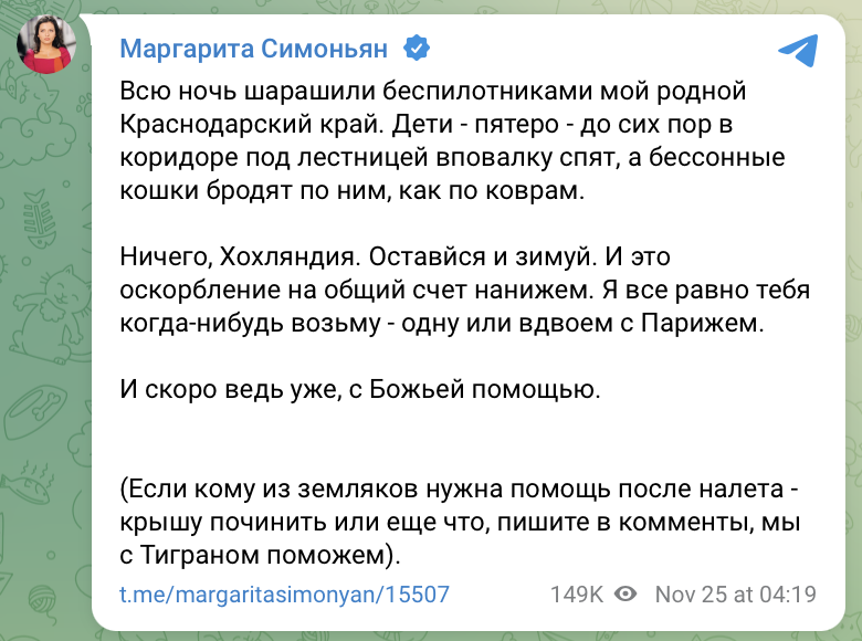 "Всю ніч шарашили безпілотниками мій рідний Краснодарський край. Діти — п'ятеро — досі в коридорі під сходами вповалку сплять, а безсонні кішки бродять по них, як по килимах. Нічого, Хо**яндія. Залишайся і зимуй. І цю образу на загальний рахунок нанижемо. Я все одно тебе колись візьму — одну або разом з Парижем. І скоро вже, з Божою допомогою", — заявила телеведуча у своєму Telegram-каналі 25 листопада.